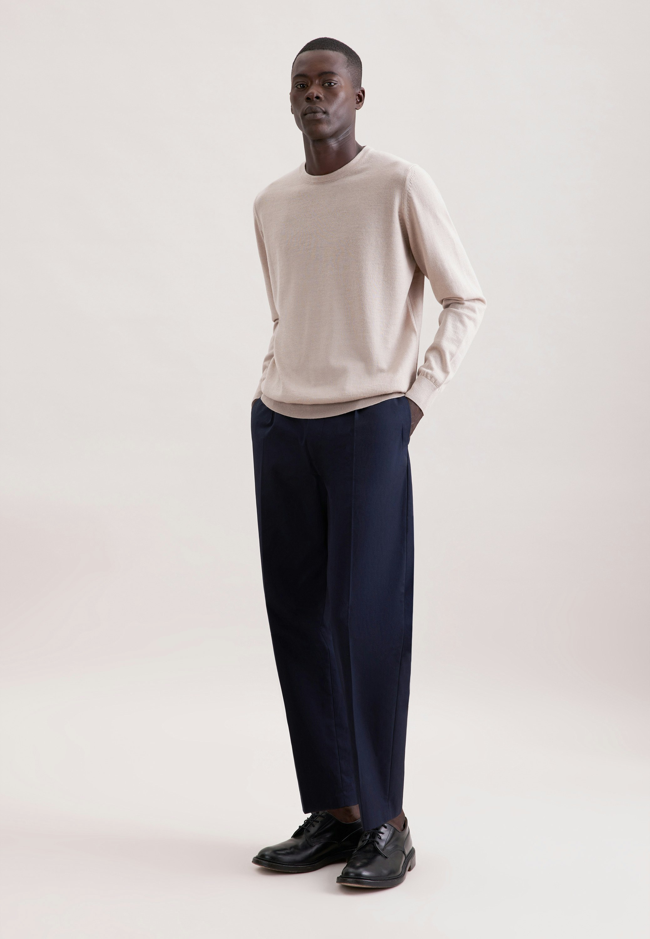 Leichter, fein gestrickter Wollpullover mit guter Passform; könnte etwas länger sein. Hervorragend, auch für wärmere Temperaturen geeignet. Schöne Farbalternative zu blau und schwarz.