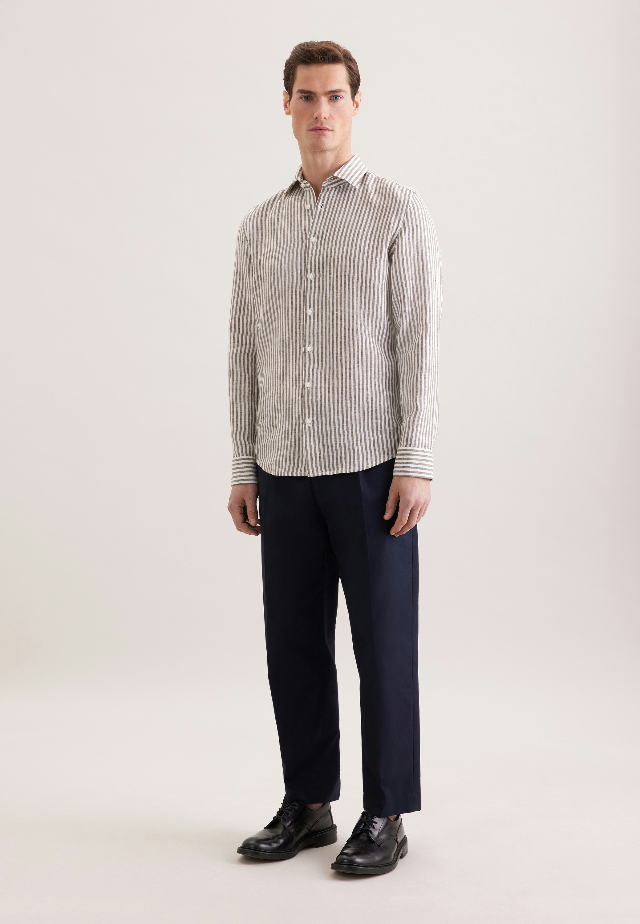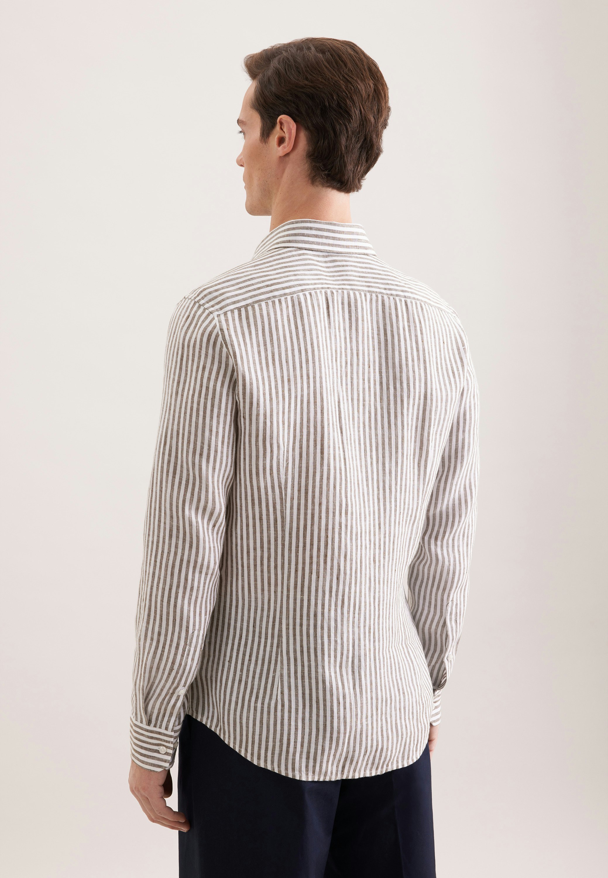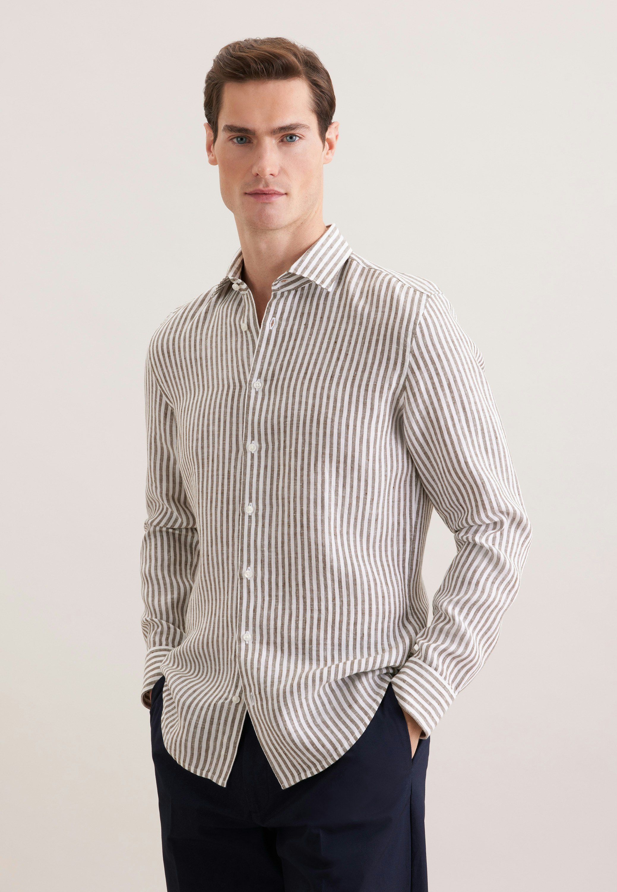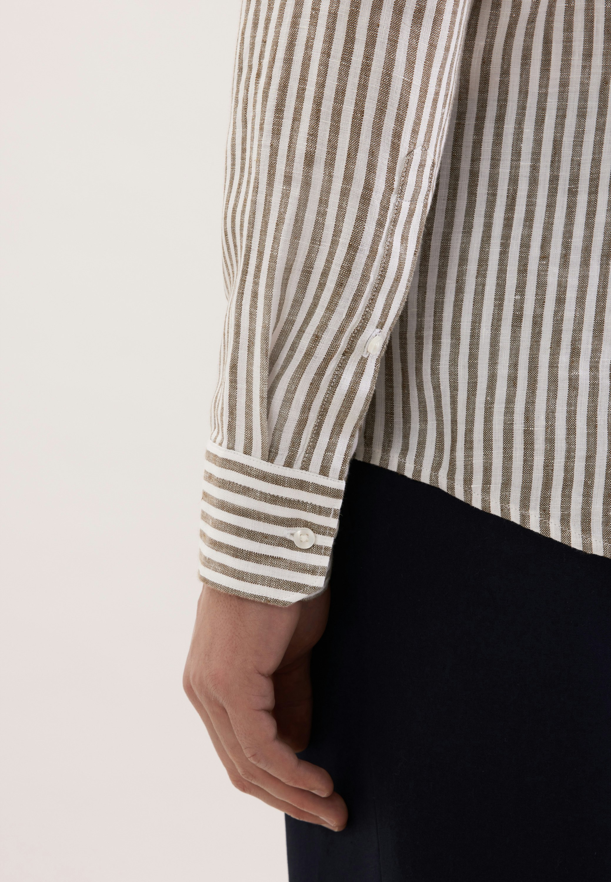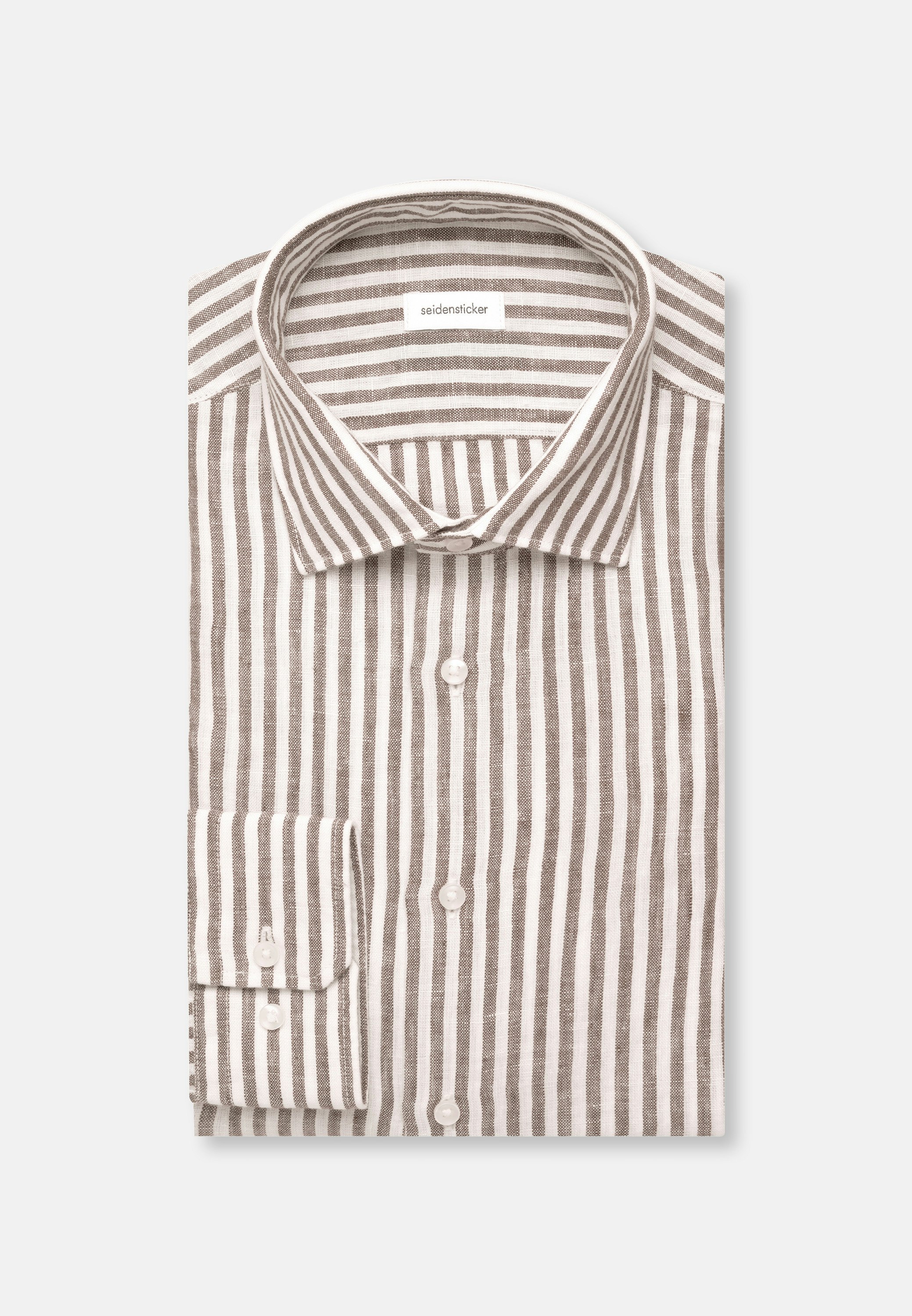 Maskuline Ästhetik: Sorgen Sie für ein stilvolles Erscheinungsbild mit dem 1/1-Leinenhemd von Seidensticker aus der "SMART LINEN" Kollektion. Ob Freizeit oder Sommer - es ist ein eleganter Begleiter, der durch schlichte Eleganz überzeugt. Mit der Passform Shaped ist das Leinenhemd figurbetont und doch weniger eng anliegend. Das charakteristische Gestreift-Muster macht es zu einem absoluten Must-have. Dieses Hemd verkörpert klassische Eleganz mit modernem Schliff. Ein Kentkragen betont den universellen Business-Charakter.