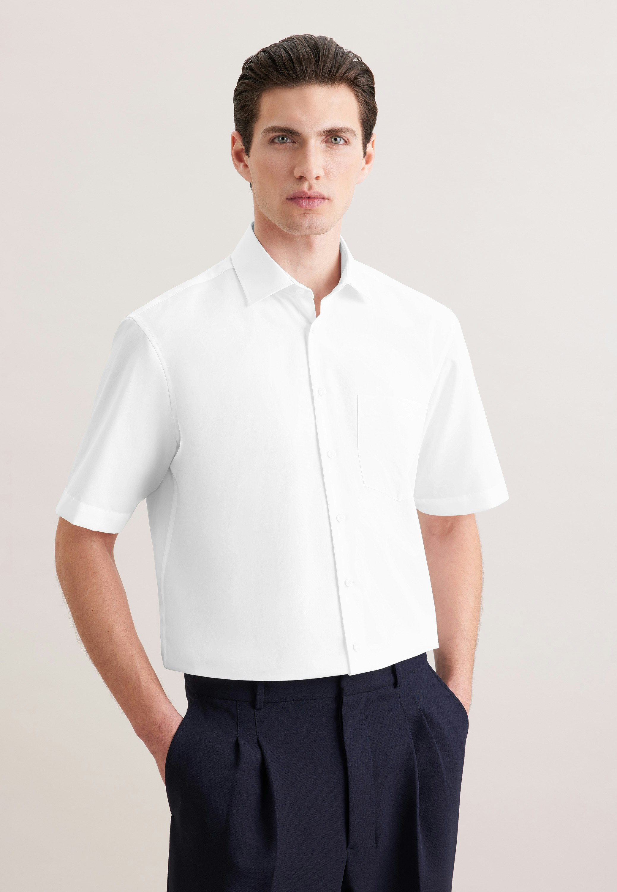 Regular Form, maskuline Ästhetik: Ihre Silhouette wird stilvoll inszeniert mit dem Regular Business Hemd von Seidensticker aus der "SMART ESSENTIALS" Kollektion. Ob Freizeit, Büro, Veranstaltungen oder Homeoffice - es ist ein eleganter Begleiter, der sich leicht kombinieren lässt. Das dank einer engen Leinwandbildung sehr strapazierfähg gewebte Fil-à-Fil ist aus 100% Baumwolle und durch einen leichten Sprenkel-Effekt unterstrichen, mit dem sich spannende Noten setzen lassen. Im klassisch-geraden Regular Schnitt bietet das Business Hemd hohen Tragekomfort und liegt leger an. Durch das Uni-Muster ist Ihr neues Kleidungsstück die perfekte Wahl für geschmackvolle Looks. Balanceakt zwischen klassischem Look und modernen Aspekten: das elegante Seidensticker Hemd. Bei diesem Kurzarm-Business Hemd werden an warmen Tagen Stilsicherheit und Eleganz hervorgehoben. Dank dem Kentkragen wird der universelle Business-Charakter besonders hervorgehoben. Zusätzlich ist eine Brusttasche aufgenäht worden.