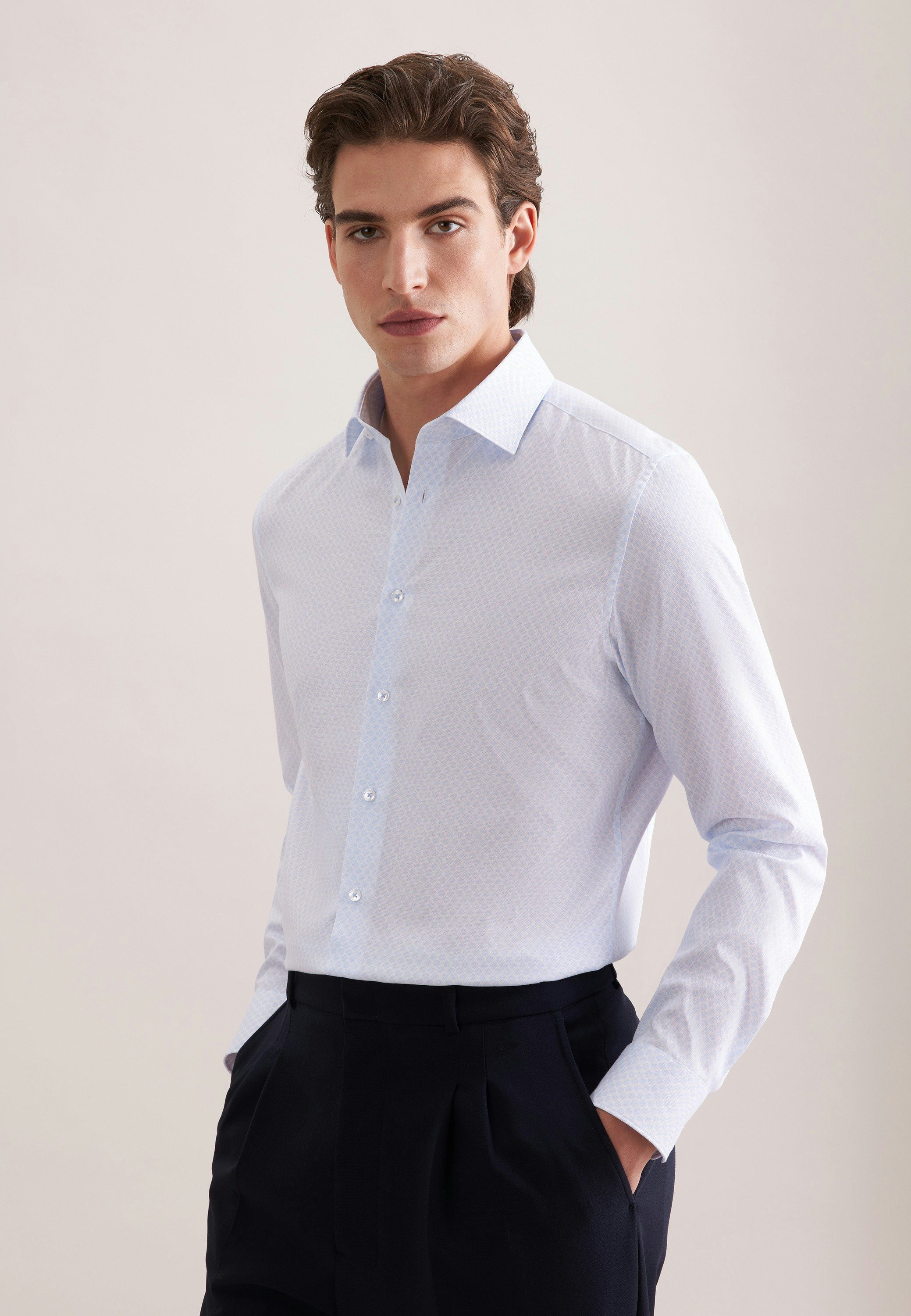 Maskuline Ästhetik: Ihre Silhouette wird stilvoll inszeniert mit dem 1/1-Business Hemd von Seidensticker aus der "SMART ESSENTIALS" Kollektion. Ob Freizeit, Büro, Veranstaltungen oder Homeoffice - es ist ein eleganter Begleiter, der durch schlichte Eleganz überzeugt. Mit der Passform Shaped ist das Business Hemd figurbetont und doch nicht so eng. Das schicke Druck-Muster macht es zu einem absoluten Must-have. Smarte Modernität mit formellen und legeren Aspekten prägt dieses Hemd von Seidensticker. Besonders herausgearbeitet wird der universelle Business-Charakter durch einen Kentkragen.
