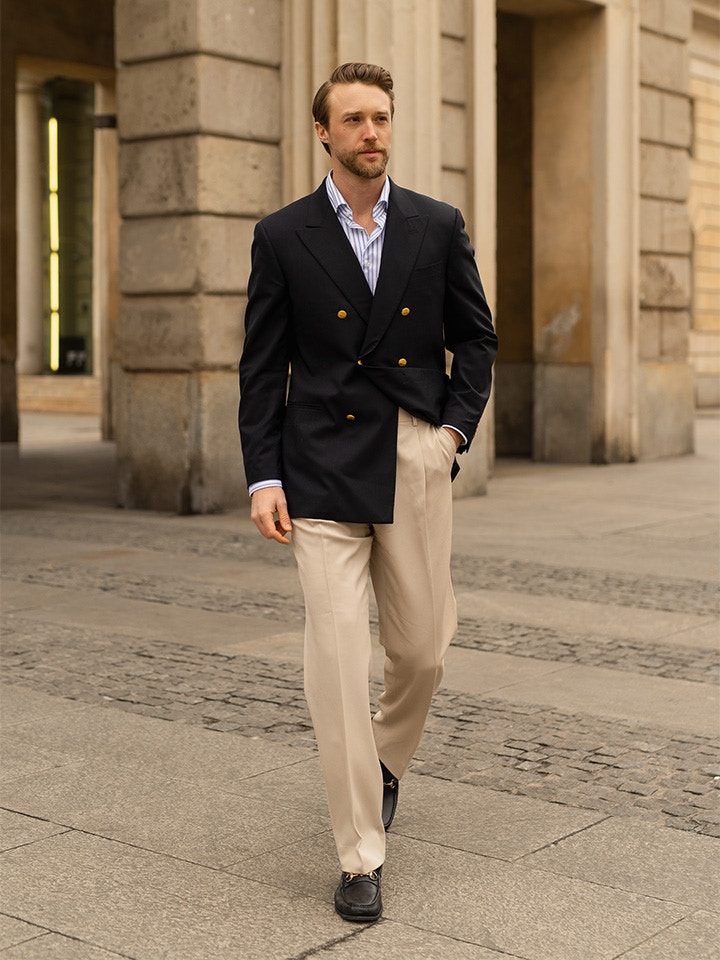 Der Reverskragen ist der endgültige Kragen für legere Anlässe: Keine Krawatte oder Fliege kann ihn bändigen, und mit einer lockeren Leinenhose und einem farbenfrohen Sakko kommt der sportliche Look besonders zur Geltung.