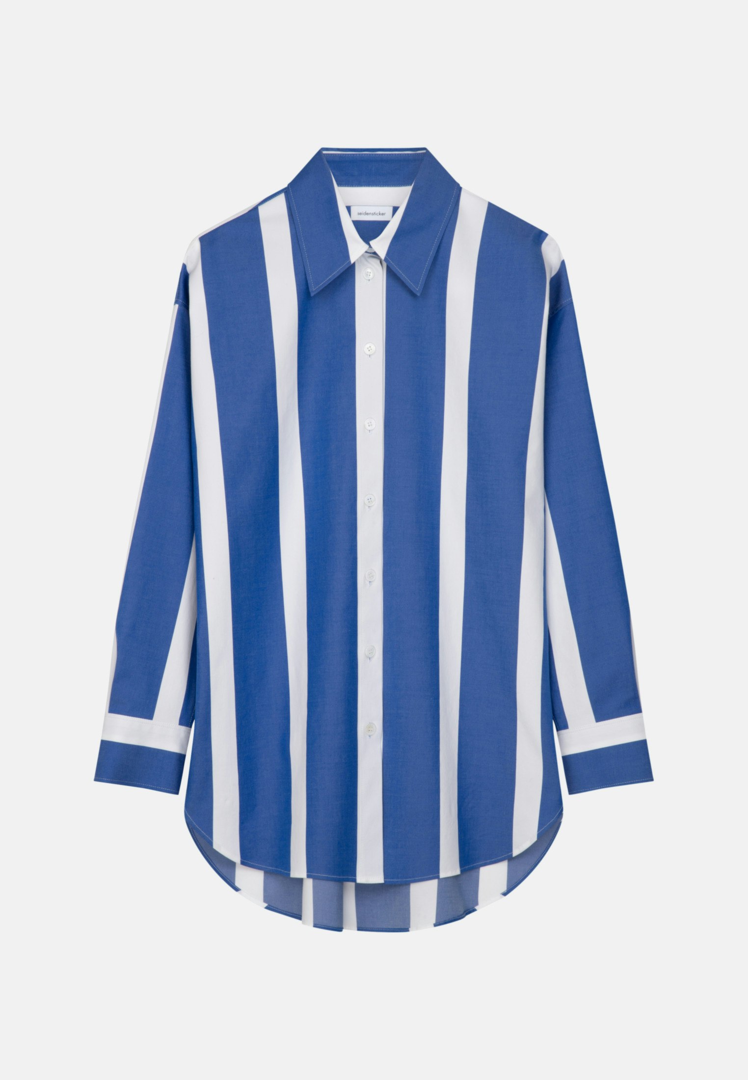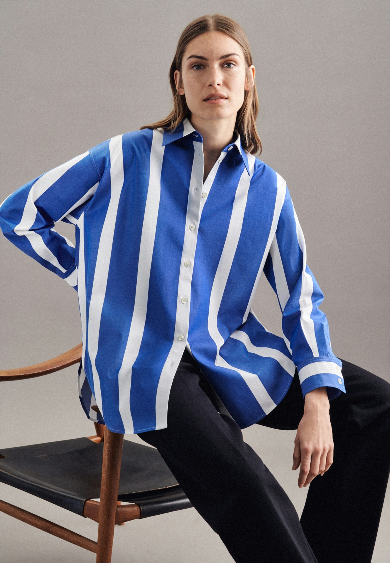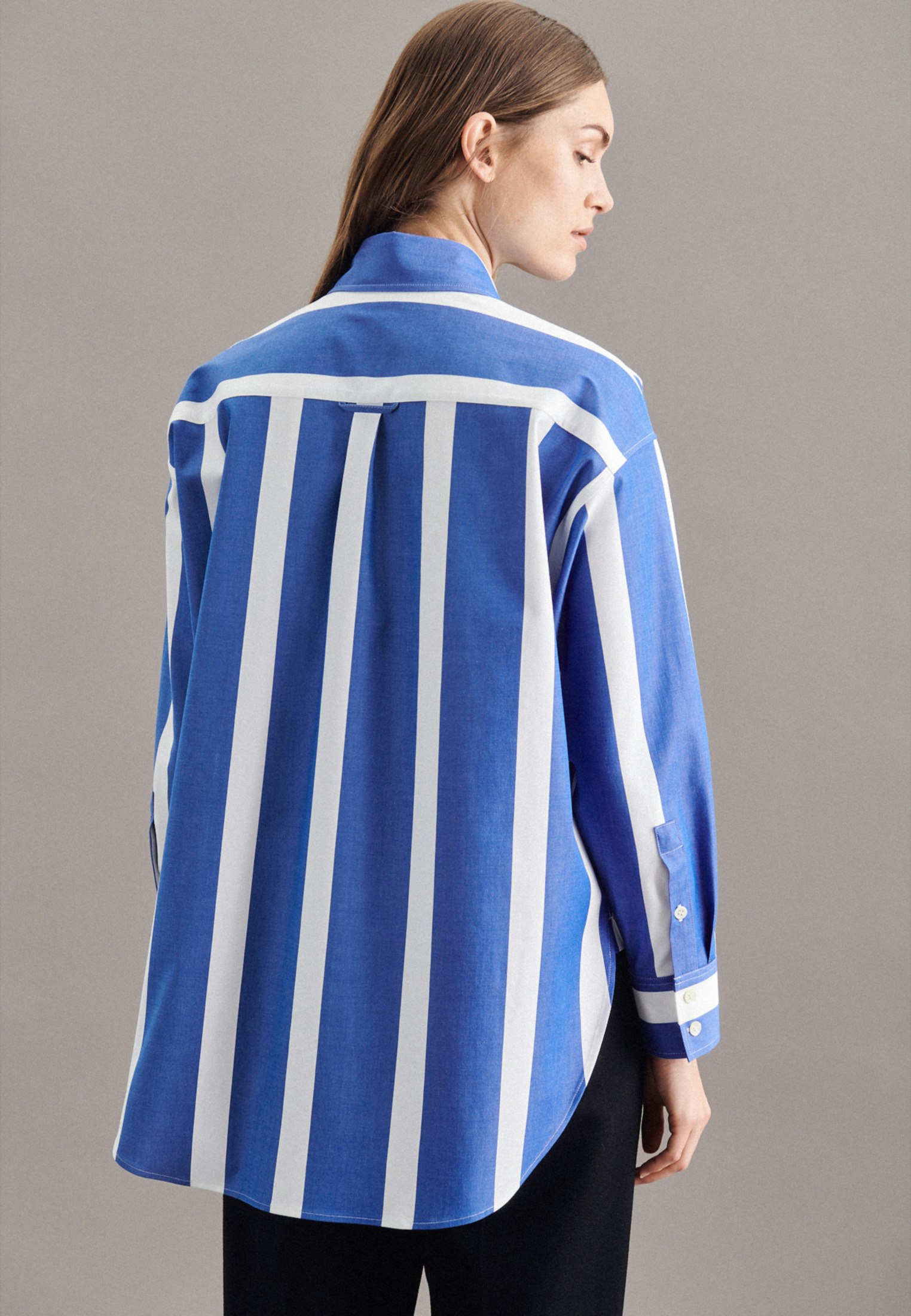 Komplettiert Ihr Outfit und sollte in keiner Garderobe fehlen: Diese Longbluse aus der "The Contemporary Basics" Kollektion von Seidensticker überzeugt durch feminine Eleganz. Sie ist ein vielseitiger Klassiker, der sich ideal für das Büro eignet und zu jeder Gelegenheit getragen werden kann. Der besonders hochwertig gewebte Twill ist aus einer Baumwollmischung, bequem zu tragen und mit schräg umlaufender Struktur außerordentlich griffig. Außerordentlich entspannt hebt die Longbluse im Oversized fit die Grenzen zwischen maskulin und feminin auf. Das attraktive Streifen-Muster setzt optische Akzente. Ein echter Hingucker, der sich als clevere Verschmelzung aus klassischer Noblesse, gepaart mit modernem Dessin präsentiert. Stilsicher und elegant liegen Sie mit dieser Langarm-Longbluse stets richtig. Ein Hemdblusenkragen unterstreicht den feminin-klassischen Charakter. Edle Perlmuttknöpfe überzeugen als dezente Details.